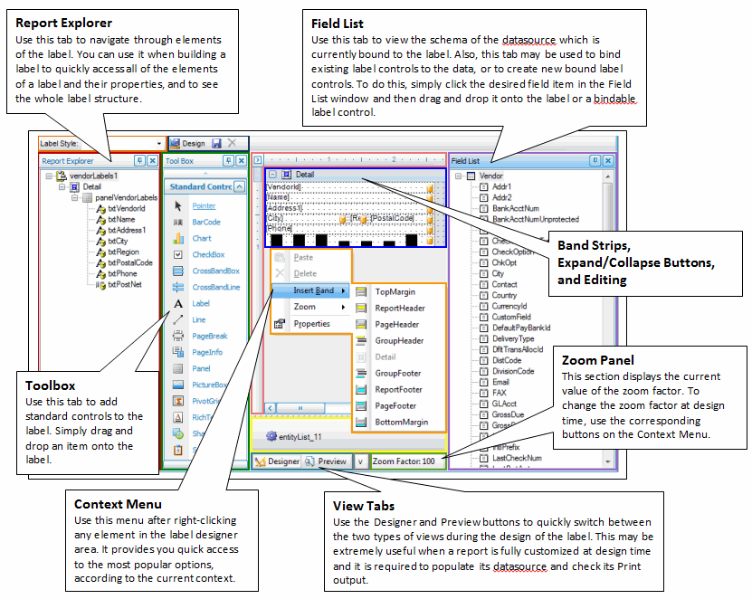 - edit a label's field by double-clicking the field and editing the text as necessary. You can also right-click on the field and select Properties to edit additional properties of the field. Click the arrow button in the upper left corner of the label design to see the task menu.