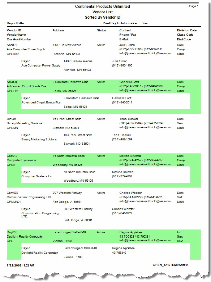 Use the Vendor List function to produce a list of the information stored in your vendor records, vendor’s name and address, pay-to name and address, purchasing information, and 1099 information.