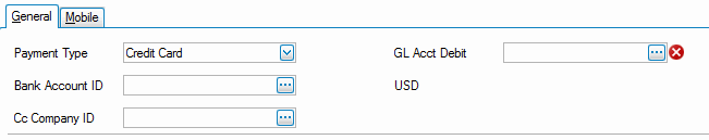- When you do not select a bank in the Bank Account ID field, you can select a credit card company ID in the Cc Company ID field. This will be a customer you set up in the Customers maintenance function with the CC Company box checked on the Defaults tab. This customer must have a payment method with the type of 'Cash' or 'Check'.