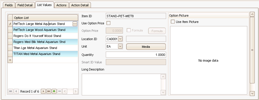 The List Values tab is where you create the list of options for the customer if you set your Data Type on the Field Detail tab to List. If you set your Line Type on the Field Detail tab to Information, you enter a list of options for the customer that may determine other options that may be available.