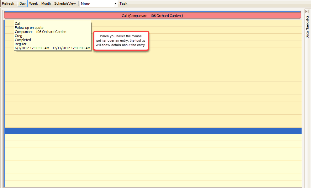 ) buttons on the lower right border of the center portion of the calendar, if available. Double-click on any calendar entry to open the Manage Tasks window for that entry, where you can change who the Task is Assigned To, Contact, Start or Due Dates, or add Notes to the entry. - The sliding Date Navigator on the right side of the calendar window displays full monthly views of the current month plus one month previous to today's date, as well as a few months into the future. This gives you a quick, convenient reference to help you schedule your Tasks.