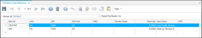 Use this screen to map the partner items to your Traverse Global items. At a minimum, the Partner ID, UIR, EDI UOM, Item ID, and UOM are required fields. Use the remaining fields for more specific information in your cross-references as needed. The Item Cross Reference function matches a trading partner’s references to your items to the item ID in your system if the item IDs do not match. For example, a trading partner may list a line item of “Widget1” on their PO. In your system, you have no “Widget1”; you know that when the trading partner orders “Widget1”, they are referencing the item “Part123” in your system. The Item Cross Reference resolves this difference to allow the inbound PO to validate and be imported into your system.