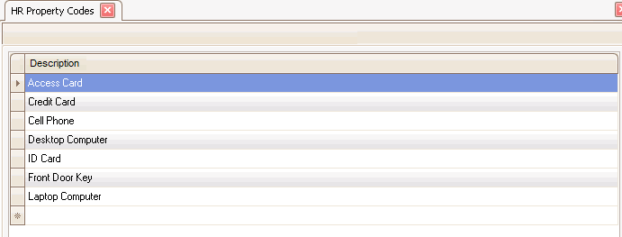 The Property Code maintenance screen and report allow you to track company property (keys, cell phones, laptops, etc.), as they are assigned to an individual.