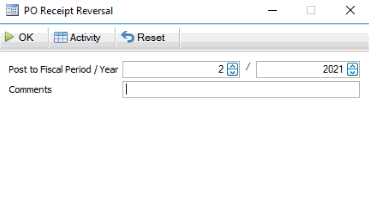 Click To OK Run the reversal process. Activity Display the Activity Log to view posting activity. Reset Set all fields to their default values. - A notification will appear when the reversal process is complete.