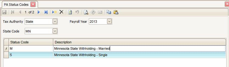 Status codes set up using this function will be available in the employee information setup on the tax tab to select the status for filing and withholding taxes for each employee. Each status code set up here must have a corresponding withholding tax table set up in the formula tables function.