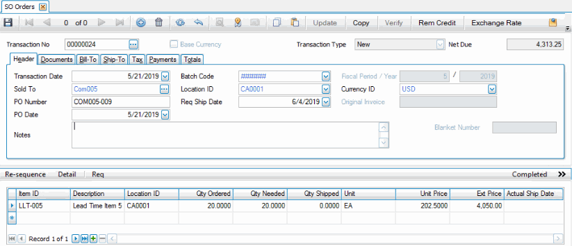 An Expected Receipt Date field has been added to the Ship-To tab on the PO Transactions screen, as well as in the line items grid at the bottom of the screen. Use this field, in either location, to indicate to the system when you want to receive the item in-house and have it available for use. The Requirements Planning process will use this date when calculating availability and purchase requisition dates.
