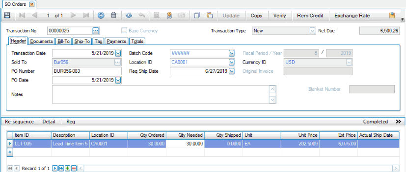 Next, create some sales orders for the item to create demand. We will create two sales orders, each with the item, for two different customers, with different requested ship dates. Sales order requested ship dates are determined by the customer’s needs when the order is placed.