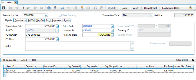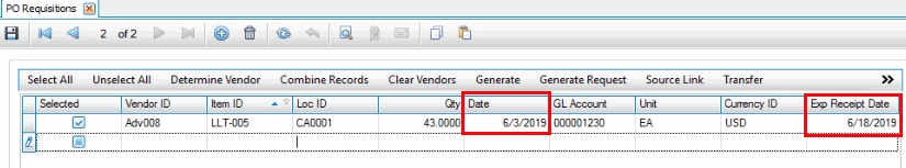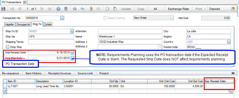 When creating purchase orders, you can ensure the items on the order are calculated properly by requirements planning by utilizing the Expected Receipt Date field. The Expected Receipt Date is the date you want to receive the order in-house. There is an expected receipt date field in the PO Transaction header on the Ship-To tab, as well as on each line item. The system will use the line item expected receipt date first, then the expected receipt date in the header if the value does not exist on the line item. If neither value exists, the system will use the PO transaction date to use for requirements planning. (Keep in mind that the PO Requested Ship Date is the date you are asking your vendor to ship the item, and not the date you want the item to arrive. The PO Requested Ship Date does not affect requirements planning.)