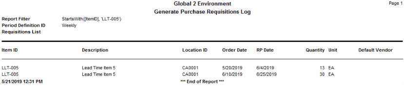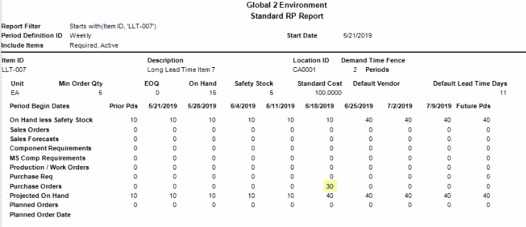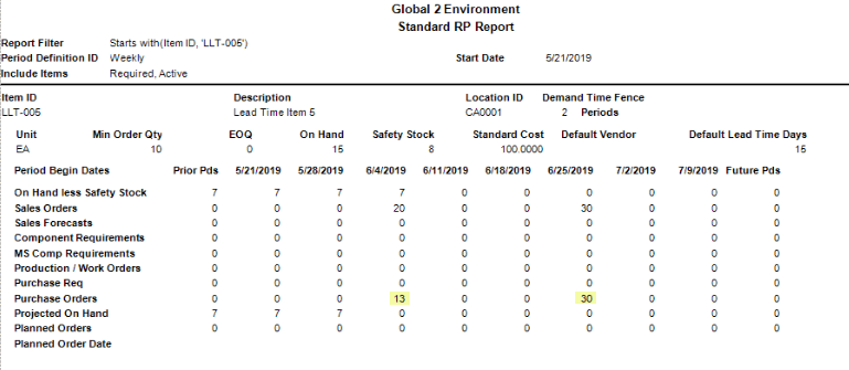 Now the RP report shows the items will be available by the PO Transaction Date. Note that even though the RP Report shows the items are available on 5/21/2019, it is not the actual date the items would be available in-house, because even if the vendor shipped the product on that day, it might take a week for those items to arrive. Using the PO Transaction Date as a basis for requirements planning calculations can be quite inaccurate.