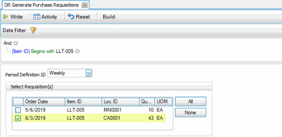 Using the Generate Purchase Requisitions function, build a list of requisitions for the item.