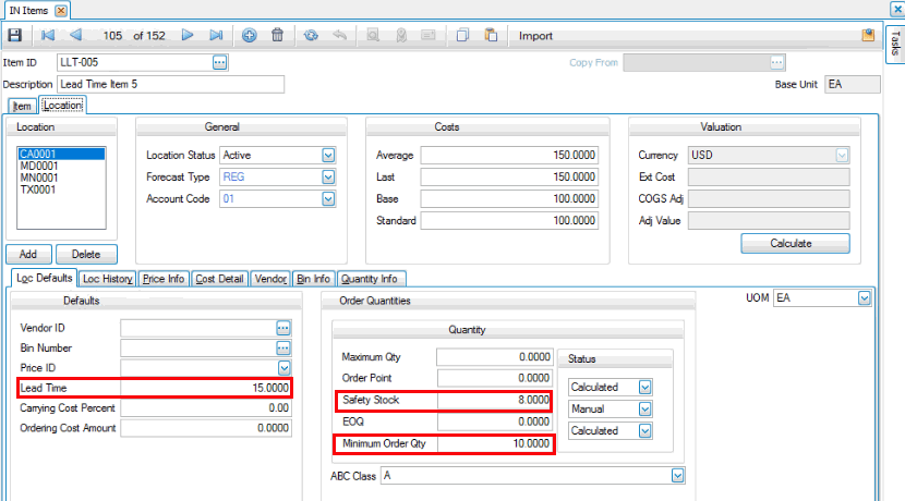 First, we will set up an item with a 15-day lead time, a safety stock quantity of 8, and a minimum order quantity of 10 with a quantity of 15 in stock.