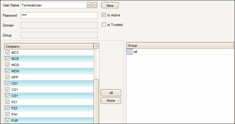 Note: If the user is using Windows authentication, check the Is Trusted check box, then enter the Windows login in the User Name field (it is not necessary to enter the domain name in the field). - Select the Is Active check box, if the user is currently active and should have access to Traverse.