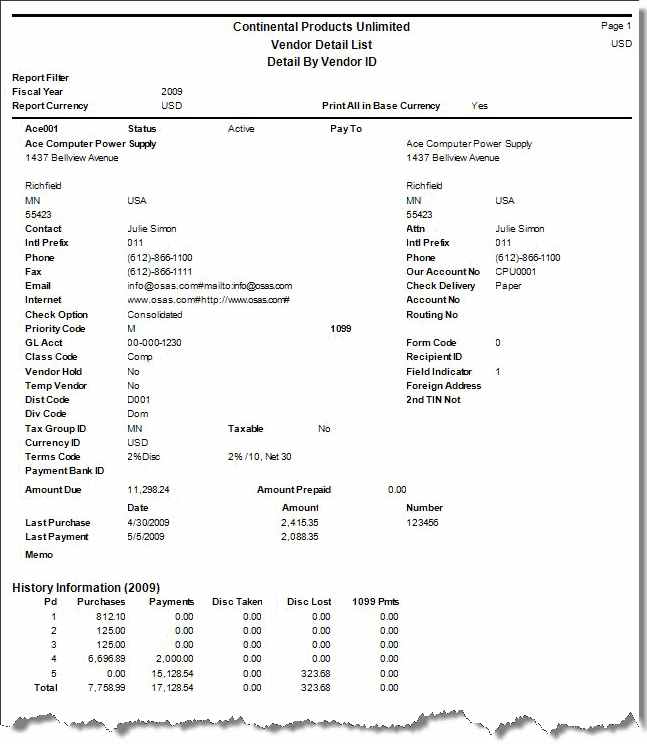 Use the Vendor Detail List function to produce a list of the information stored in your vendor records, including the vendor's name and address, pay-to name and address, purchasing information, and 1099 information.