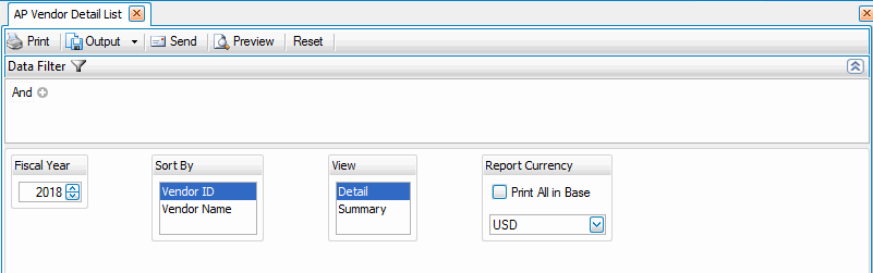 • To print all vendors (regardless of the currency in which they were set up with), select the base currency as the report currency and select the Print All In Base currency check box.